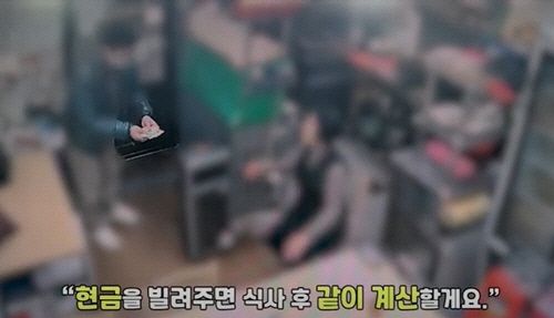 차량 견인됐다고 거짓말한 뒤 식당 주인에게 돈 빌리는 A씨 모습. [사진=대전경찰청]