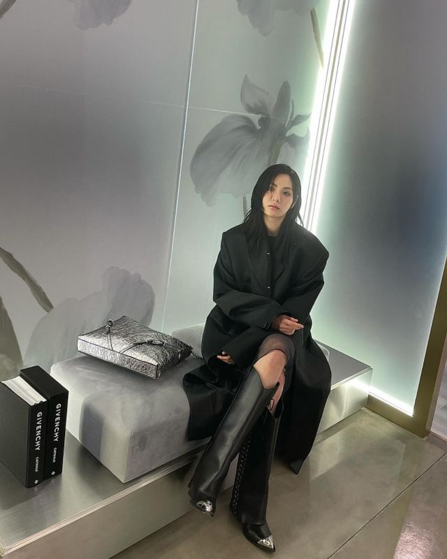 공개된 사진 속 나나는 블랙 이너가 그대로 비치는 시스루 톱에 하의 또한 극단적으로 짧은 팬츠리스 룩을 선보였다. 여기에 은은한 시스루 스커트를 덧입고 매니시한 블랙 코트와 롱부츠를 매치해 멋스러움이 넘치는 스타일링을 완성했다.