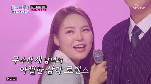 미스김은 지난 15일 방송된 TV조선 트로트 서바이벌 프로그램 ‘미스트롯3’에 출연했다. 이날 방송에서는 TOP10 결정전인 5라운드 라이벌 매치 1차전 삼각대전이 펼쳐졌다.