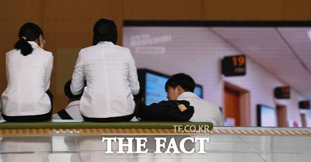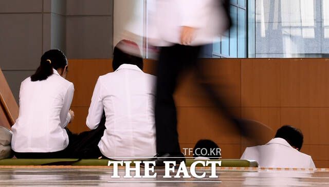 [더팩트ㅣ이새롬 기자] 서울 주요 5개 대학병원 전공의들이 정부의 의대 증원에 반발해 병원 근무를 중단하겠다고 밝힌 가운데, 16일 오전 서울의 한 대학병원에서 의료진들이 쉼터에 모여 있다.