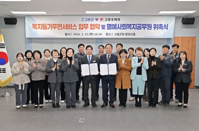 [파이낸셜경제=김예빈 기자] 고흥군은 지난 15일 고흥군청 팔영산홀에서 고흥우체국(국장 박동원)과 ‘복지등기 우편서비스 업무 협약’을 체결하고 이날 참석한 집배원에게 명예 사회복지공무원 위촉장을 수여했다고 밝혔다.