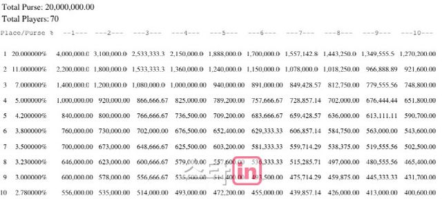 컷오프가 있지만, 상금은 70명 모두가 받는다. 최하위 70위 상금은 3만2000달러다. 참가만 해도 약 4250만원의 상금은 확보한 것이나 마찬가지다. 컷오프 기준인 50위 상금은 5만2000달러(약 6900만원)이고, 톱10에 들면 55만6000달러(약 7억4000만원) 이상의 상금을 챙길 수 있다.