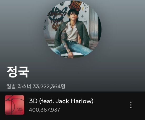 방탄소년단(BTS) 정국이 지난해 9월 발매한 두 번째 솔로 싱글 '3D'가 세계 최대 음원 스트리밍 플랫폼 스포티파이에서 4억 스트리밍(필터링 전)을 넘어섰다.