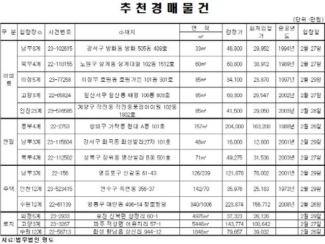 서울 노원구 상계동 한신 아파트 5동 604호가 경매 나왔다. 노원초등학교 북측 인근에 소재한 물건으로 5개동 397가구의 아파트 단지로 1995년 10월에 입주했다. 14층 건물 중 6층으로 남향이며 84.8㎡(32평형)의 2베이 구조로 방이 3개다. 동일로, 수락산로 등을 통해 차량 진 출입이 수월하다. 노원초등, 상계중, 청원고교 등이 단지 인근에 있어 교육환경은 양호하다. 감정가 6억8500만원에서 두 차례 떨어져 4억3840만원에 매각이 진행된다. 등기부 등본상 근저당 2건 등은 매각 후 잔금 납부시 소멸된다. 소유자가 거주하고 있어 매각 시 인도부담이 적다. 시세는 5억6000만원에서 6억2000만원에 거래되고 있으며 전세가는 3억1000만원에서 3억7000만원 선이다. 매각일자는 2월 27일 서울북부지방법원 경매 4계다. 사건번호 23 - 102175