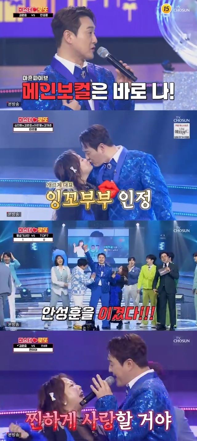 개그맨 김원효가 아내 심진화와 화끈한 키스 퍼포먼스를 ‘미스터로또’에서 선보였다.