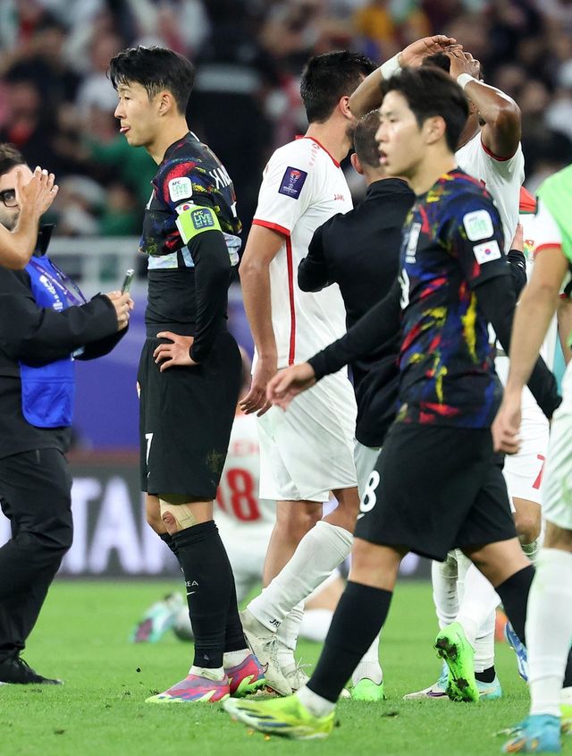 지난 6일(현지 시각) 카타르 알라이얀 아흐메드 빈 알리 스타디움에서 열린 2023 아시아축구연맹(AFC) 카타르 아시안컵 준결승 요르단과 대한민국의 경기를 마친 손흥민과 이강인 모습. / 뉴스1