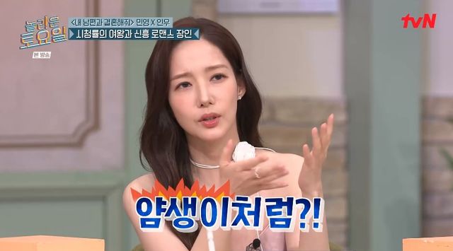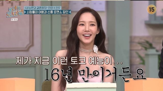 박민영은 "토크 예능 출연이 16년 만이다. 실수를 많이 할 것 같다. 잘 봐주셨으면 좋겠다"라고 당부했다.