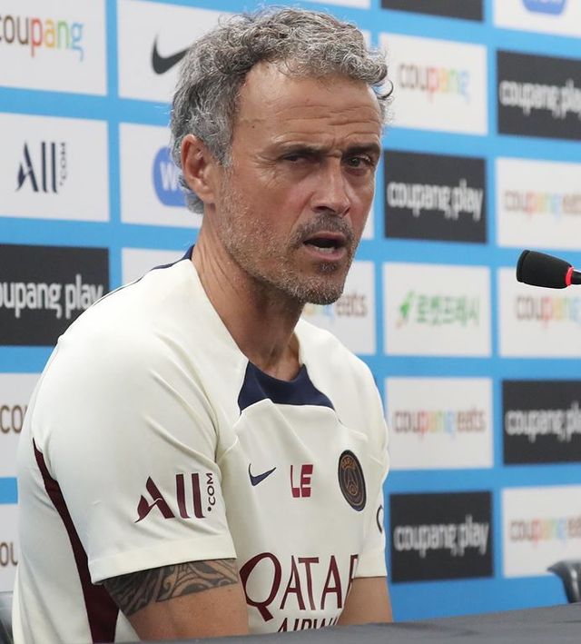 루이스 엔리케 파리 생제르맹(PSG) 감독이 2일 오후 부산 연제구 부산아시아드주경기장에서 K리그1 전북 현대와 쿠팡플레이 3차전을 앞두고 열린 기자회견에서 취재진 질문에 답변하고 있다. / 뉴스1