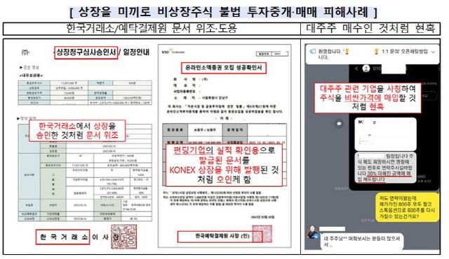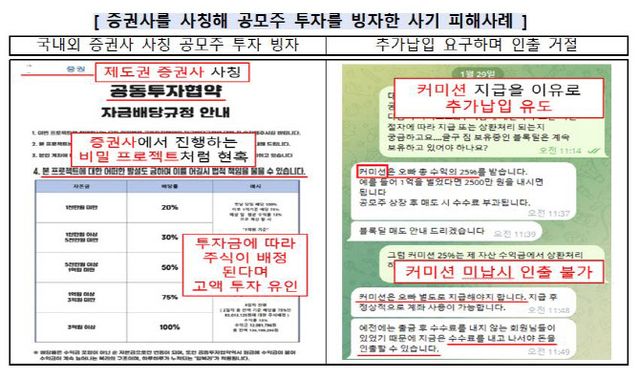 일례로 생성형 AI, 공모주 기관 배정, 계좌대여, 증권사가 수행하는 프로젝트 등으로 고수익을 낼 수 있다며 가짜 투자 앱 설치를 유도해 자금을 챙겼다. 한국거래소, 한국예탁결제원의 문서를 위조·도용하고 광고성 보도자료를 활용해 특정 비상장주식의 상장이 임박한 것처럼 꾸민 후 고가에 매각하는 사기 행각도 적발됐다. 유튜브 등으로 투자 정보를 무료로 제공하며 투자자를 유인한 뒤 주식리딩 서비스 등을 미끼로 유료 멤버십 가입을 유도하는 경우도 있었다.