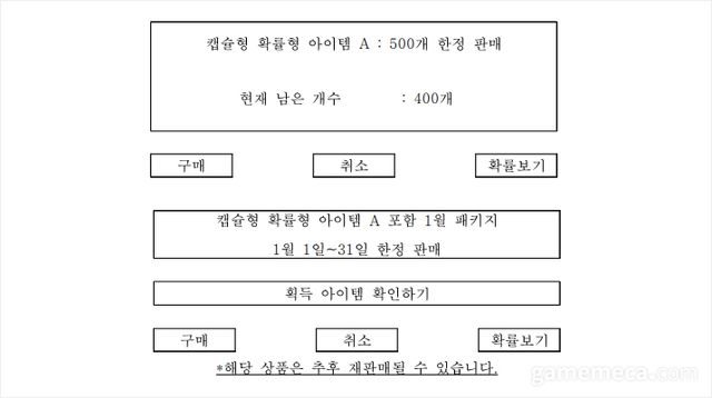 우선 확률형의 경우 획득할 수 있는 모든 결과물 종류, 등급, 성능별 확률 정보를 공개해야 하며, 판매 기간이나 서버당 획득할 수 있는 아이템 수량이 한정된 경우 이 역시 기간, 수량, 풀리는 수에 따라 달라지는 확률 등을 같이 안내해야 한다.