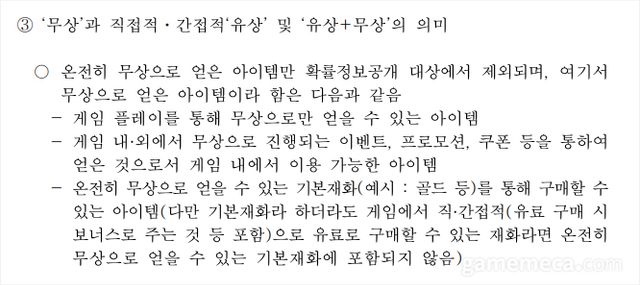 따라서 유료 결제 요소 없이 온전히 무상으로 얻은 아이템만 확률 정보공개에서 제외된다. 구체적으로 플레이를 통해 무상으로 얻은 아이템, 온전히 무상으로 획득할 수 있는 기본 재화로 구매할 수 있는 아이템, 이벤트나 쿠폰 사용 등으로 획득한 아이템 등이다.