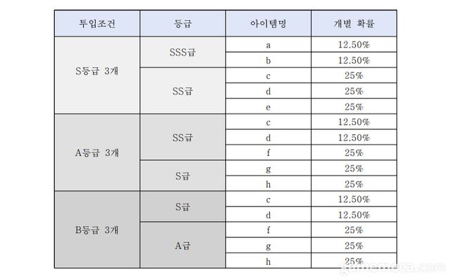 강화 및 합성형 역시 아이템 합성 결과에 따라 등급이 구분되고, 등급에 따라 나오는 아이템이 달라지는 경우 등까지 개별 확률을 모두 공개하여 소비자가 각 상황에 맞춰 관련 정보를 확인할 수 있도록 해야 한다.