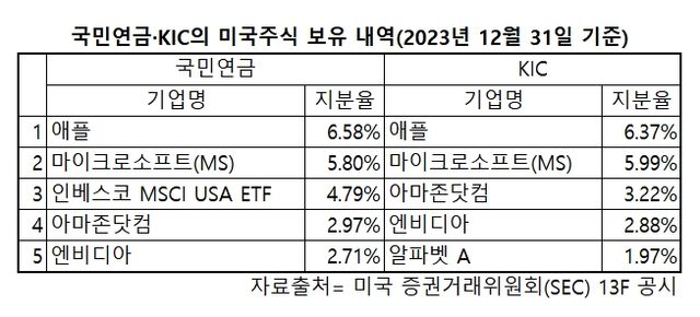 2023년 12월 말 현재 국민연금의 미국 주식 직접투자 보유 비중 1위는 애플(6.58%)이다. 이어 마이크로소프트(5.8%), 인베스코 MSCI USA(PBUS) ETF(4.79%), 아마존닷컴(2.97%), 엔비디아(2.71%) 순이다.