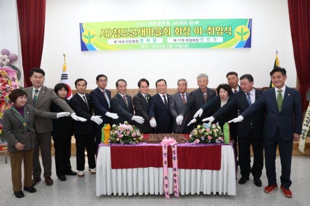 [파이낸셜경제=김영란 기자] (사)청도군 새마을회는 지난 16일 새마을회관 대회의실(3층)에서 김하수 청도군수, 김효태 청도군의회 의장, 군의회 의원 및 읍면 새마을회장 등 90여 명이 참석한 가운데 제16대 정해용 회장과 제17대 전인주 회장의 이·취임식을 가졌다.