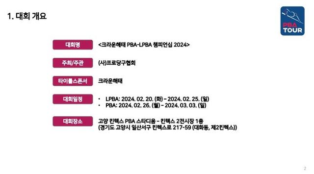1. 대회명: 크라운해태 PBA-LPBA 챔피언십 2024