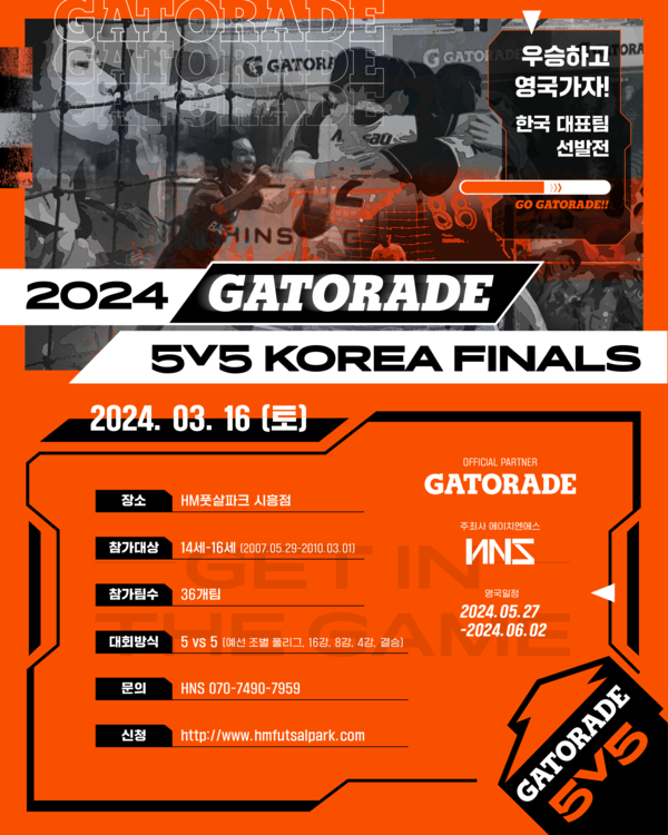 대한민국 최고의 아마추어 중학생 풋살 대회인 ‘2024 게토레이 5v5 코리아 파이널스’가 오는 3월 16일(토) HM풋살파크 시흥에서 열린다. 지난 2022년부터 개최중인 이 대회는 스포츠마케팅 기업 (주)HNS가 주최하고 게토레이가 메인 파트너로 참가한다.