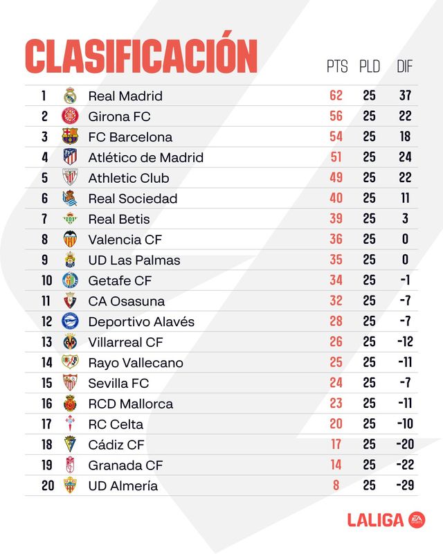 레알은 이어진 라요 바예카노 원정 25라운드에서 1-1로 비기며 승점 1점 확보에 그쳤지만, 지로나가 2연패를 당하며 조금이나마 달아날 수 있었다. 레알은 선두(19승 5무 1패 승점 62)로 앞서 나갔고 지로나는 2위(17승 5무 3패 승점 56)지만, 승점 6점 차, 2경기 차로 격차가 벌어졌다.