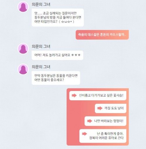 참여자 이름을 설정하면 '의문의 그녀'와 함께하는 대화방에 입장 ▲주말 일과 ▲좋아하는 음료 ▲방 꾸미기 스타일 ▲선호하는 애완동물 ▲이상형까지 취향에 대한 다양한 이야기를 나누게 된다.