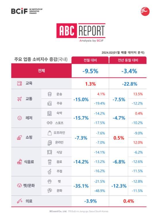 'ABC(Analysis by BCiF) 리포트' 13호에 따르면 주요 7개 분야 중 교육(1.3%↑)을 제외한 교통(운송/주유), 레저, 쇼핑, 식음료, 의료, 펫/문화 등 모든 분야에서 매출이 하락했다.