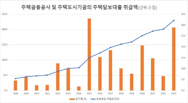 이는 박근혜 정부 시절, 최경환 전 경제부총리 겸 기획재정부 장관이 2014년 ‘빚내서 집 사라’를 외친 후 2015년 정책금융의 주담대가 무려 33조원 급증한 이후 가장 크게 늘어난 것이다. 2022년 6조6000억원 증가한 것과 비교하면 4배 넘게 급증한 것이다.