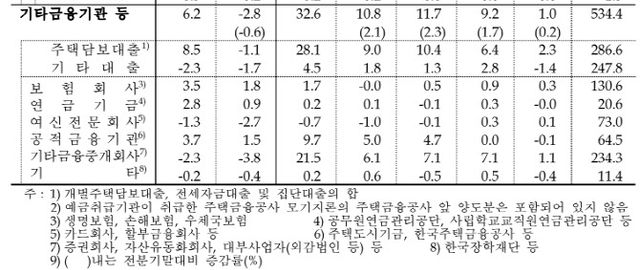 주금공, 주택도시기금 등 공적금융기관이 취급하는 대출은 예금취급기관과 별도로 ‘기타금융기관 등’의 하위 분류에서 집계된다. 기타금융기관 등은 보험회사, 연금기금, 여신전문회사, 공적금융기관 등으로 나뉘는데 이중 공적금융기관의 작년 한 해 대출 증가폭은 9조7000억원에 불과하다. 이 역시 역사상 최대폭 증가이지만 특례보금자리론 취급액의 3분의 1수준에 불과하다.
