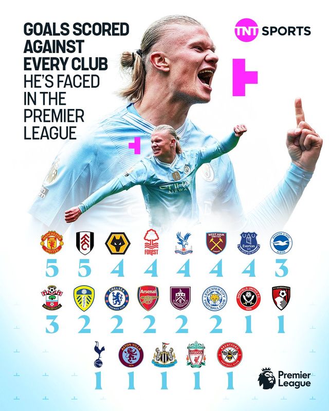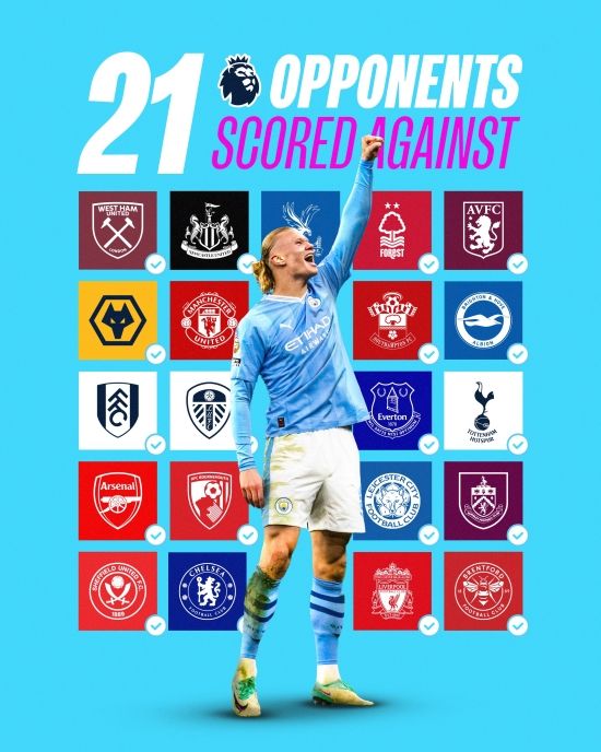 특히 홀란은 지난 시즌 맨시티로 이적해 프리미어리그에 입성했는데 단 두 시즌 만에 그가 상대한 모든 프리미어리그 구단을 상대로 득점에 성공했다. 브렌트퍼드를 상대로 첫 득점에 성공하면서 대기록을 달성했다.
