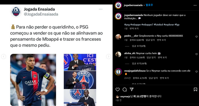 문제는 이렇게 음바페를 비난하는 글에 네이마르가 '좋아요'를 누른 것이다. '데일리 메일'은 "'조가다 엔사이아다'의 주장은 많은 축구 팬들 사이에서 회자되는 대표적인 의견 중 하나지만 이것이 전 동료로부터 호응을 받았다는 것은 충격적"이라며 사태의 심각성을 알렸다.