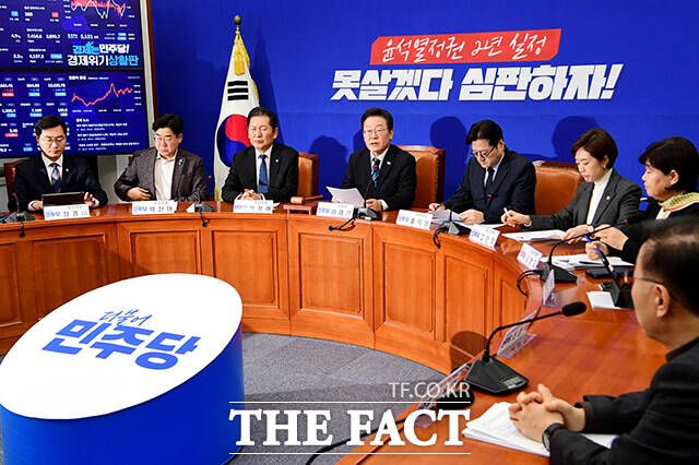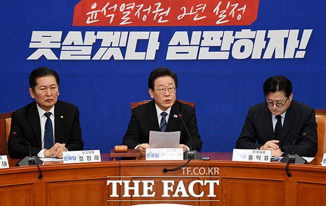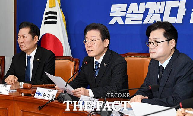 이재명 더불어민주당 대표(가운데)가 21일 오전 서울 여의도 국회에서 열린 최고위원회의에 참석해 모두발언을 하고 있다. /국회=배정한 기자