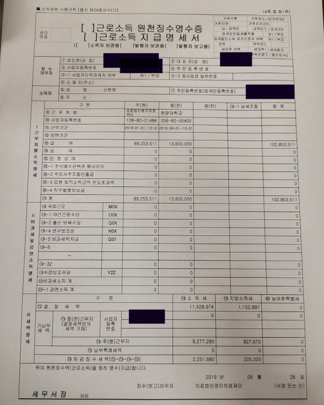 이에 신 의원은 “저의 종합병원 근무시절 근로소득 원천징수명세서를 공개한다”며 지난 2019년 5월 자신의 근로소득 원천징수영수증을 공개했다. 신 의원의 당시 연봉은 약 1억 285만원이다.