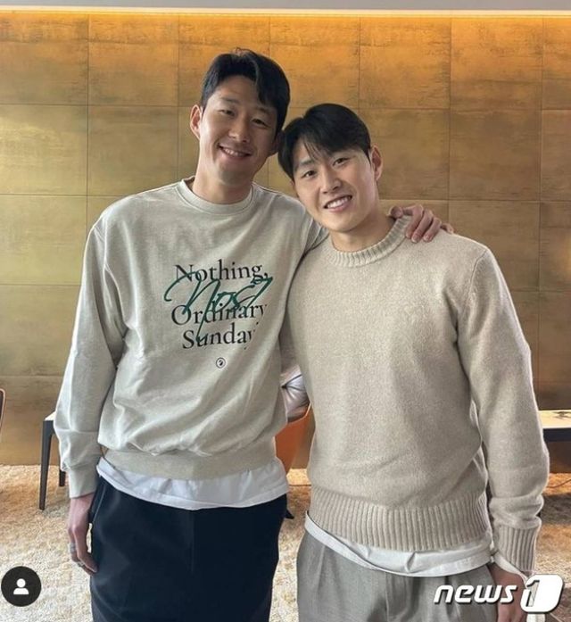 손흥민이 지난 21일 자신의 SNS에 이강인이 영국 런던까지 찾아와 사과했다며 "이강인을 너그럽게 봐달라"라는 글과 함께 어깨동무하고 있는 사진을 올렸다. 손흥민 오른 손가락엔 여전히 압박붕대가 감겨 있다 / 뉴스1, 손흥민 인스타그램