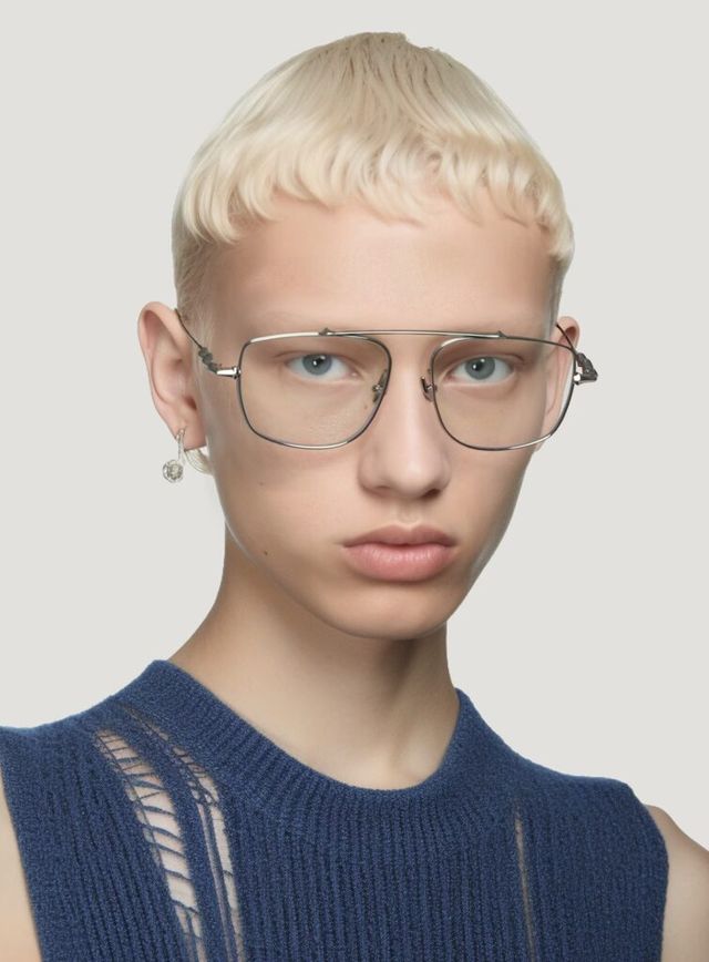 구조적인 스퀘어 셰입이 돋보이는 젠틀 몬스터의 ‘마틴 02’ 안경입니다. 티타늄 소재로 만들어 가벼운 착용감이 특징인데요. 긱시크 안경하면 떠오르는 뿔테 프레임 대신 메탈 프레임을 선택하면 더욱 유니크하죠. 니트에 함께 매치하면 소재에서 오는 이질적인 대비감 덕분에 긱시크 무드를 완성할 수 있습니다.