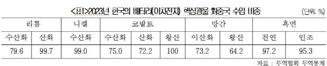 현재 글로벌 배터리 공급망은 광물 채굴·제련 및 배터리 셀 생산 등 주요 단계에서 중국이 상당 부분을 차지하고 있다. 한국도 배터리 핵심광물 5대 품목인 리튬, 니켈, 코발트, 망간, 흑연 등에 대한 중국 수입 의존도가 높은 상황이다.