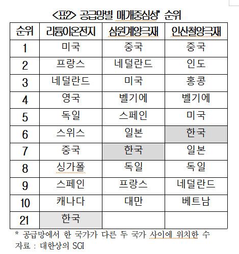 한국이 가장 많이 수출하는 삼원계 양극재의 경우 한국의 매개중심성은 전세계 7번째로 공급망 내 위상은 수출액에 비해 낮은 상황이다.