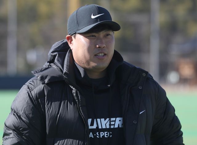 류현진이 2022년 2월 3일 오전 경남 거제시 하청스포츠타운에서 인터뷰 종료 후 이동하고 있다. / 연합뉴스