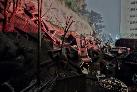 23일 충남소방본부 등에 따르면 전날 오전 3시 20분쯤 태안군 태안읍 평천리 한 아파트 단지 내 주차장에서 높이 약 6m 옹벽이 무너져 내렸다.