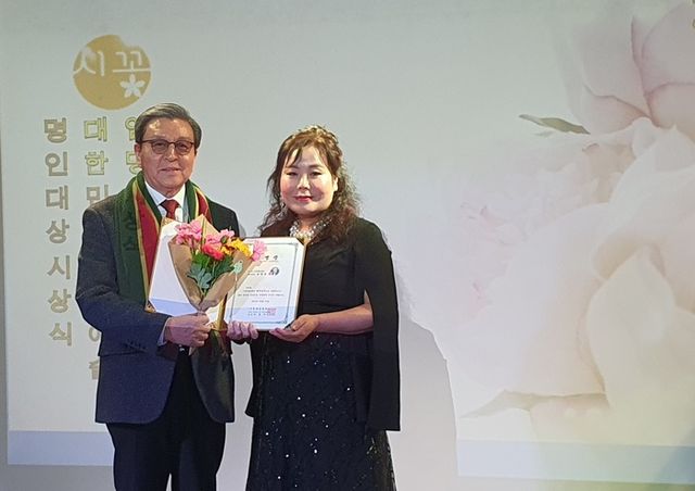 귀하는 아름다움을 표현하고 창조하는 예술문화 발전의 선도자로 대한민국 문화예술의 저변 확대와 활동에 기여한 공로가 크므로 시꽃예술 명인대상 수상자로 선정되어 이 상패를 드립니다.