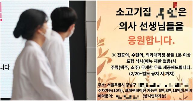 23일 페이스북 등에 따르면 서울 강남에서 암소 한우를 판매하는 한 소고기 전문 식당은 '의사 선생님들을 응원합니다'라는 응원 문구를 내걸고 "전공의·수련의·의대생 1분 이상 포함 식사할 때 주류 무제한 무료 제공해 드린다"는 안내문을 게재했다.