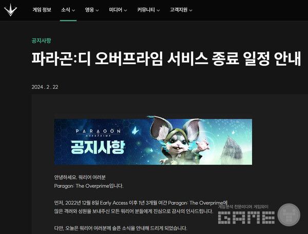 운영진은 "파라곤 디 오버프라임(Paragon: The Overprime)은 얼리 액세스 이후 이용자들의 기대에 부응할 수 있도록 여러 가지 방안들을 찾고 반영하며 다양한 방면으로 지속적으로 고민해 왔다."면서 "그러나 앞으로 이용자들을 만족시키고 안정적인 서비스를 제공하기에는 부족하다고 판단되어 심사숙고 끝에 2024년 4월 22일(월) 서비스 종료라는 결정을 내리게 되었다."고 전했다.