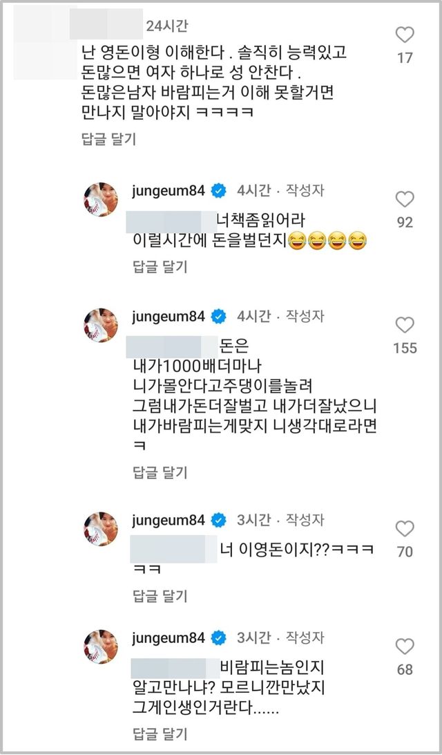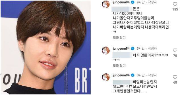 이에 황정음은 "너 책 좀 읽어라. 이럴 시간에 돈을 벌던지"라며 "돈은 내가 1000배 더 많아. 네가 뭘 안다고 주둥이를 놀려. 네 생각대로라면 내가 돈 더 잘 벌고 내가 더 잘났으니 내가 바람피우는 게 맞지"라고 답글을 달았다.