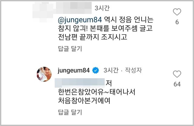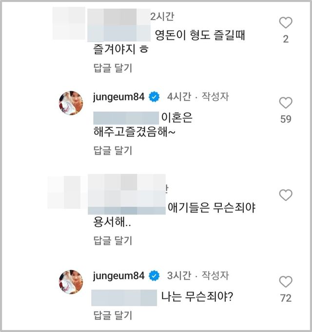 또 한 네티즌이 "역시 정음 언니는 참지 않지! 본때를 보여주셈. 그리고 전남편 끝까지 조지시고"라고 댓글을 달자 황정음은 "저 한 번은 참았어유~ 태어나서 처음 참아본 거예여"라고 답글을 달았다.