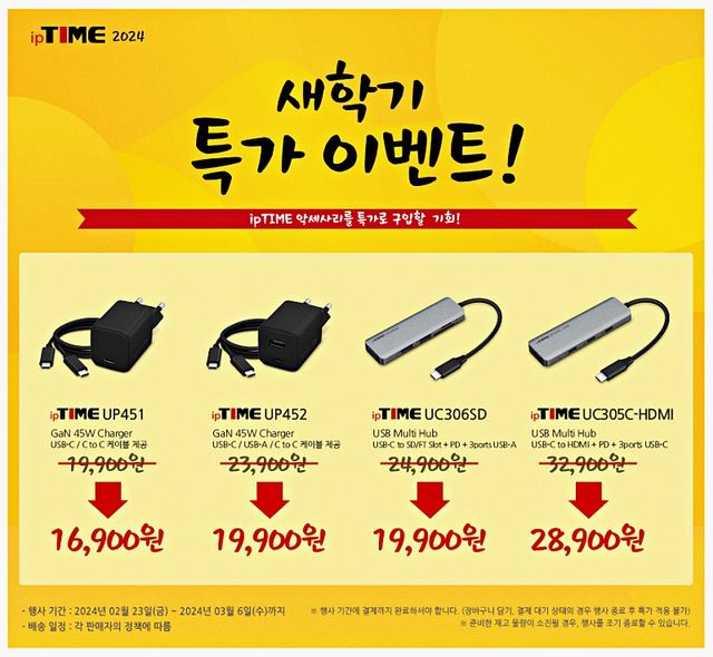 아이피타임은 45W GaN 고속 충전기와 USB C 타입 멀티 허브 제품군을 대상으로 최대 20% 할인 판매를 예고했다. 할인 대상 UP451과 UP452는 GaN 적용으로 기존 충전기 대비 크기와 무게를 줄이면서 충전 효율성을 높였다.