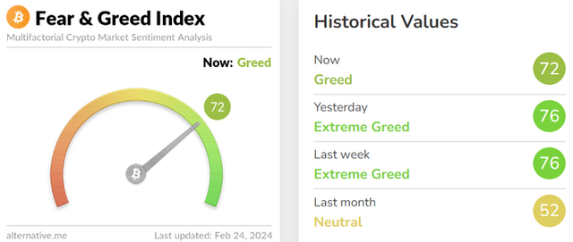 한편 암호화폐 데이터 제공 업체 얼터너티브(Alternative)의 자체 추산 '공포·탐욕 지수'는 전날보다 4포인트 내린 72를 기록했다. 투심이 소폭 악화되며 '극단적 탐욕' 단계에서 '탐욕' 단계로 전환됐다. 해당 지수는 0에 가까울수록 시장의 극단적 공포를 나타내며, 100에 가까울수록 극단적 낙관을 의미한다.