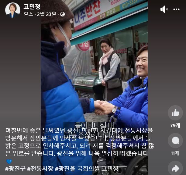 고 의원은 현재 서울 광진구을 단수공천을 받아 오신환 전 국민의힘 의원과 총선 경쟁을 앞두고 있다. 이 같은 상황에서 고 의원은 24일 자신의 페이스북에 휠체어를 타고 선거구를 돌아다니는 모습을 공개했다.