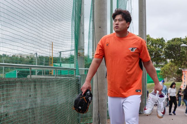 류현진이 23일 일본 오키나와현 고친다 구장에서 열린 한화 이글스 2차 스프링캠프 훈련을 마친 뒤 이동하고 있다.[연합뉴스]