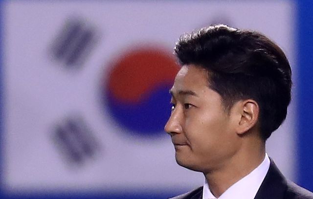 이천수가 2016년 3월 24일 오후 경기도 안산 와스타디움에서 열린 2018 러시아 월드컵 아시아지역 2차 예선 대한민국 대 레바논 경기 하프타임 때 열린 은퇴식에서 소감을 밝히고 있다. / 연합뉴스