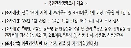 국민건강영양조사는 ‘국민건강증진법’ 제16조에 따라 매년 전국 192개 지역에서 선정된 4,800가구의 1세 이상 가구원 약 1만 명을 대상으로 이동검진차량 내에서 건강 및 영양상태에 대한 약 400개 항목을 조사한다.