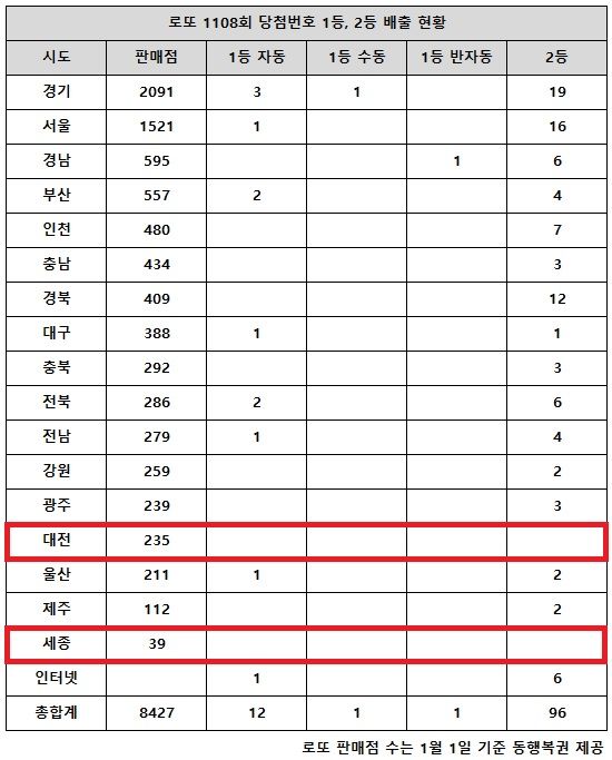 동행복권이 24일 추첨한 로또 1108회 당첨번호 조회 결과 1등은 14명, 2등은 96게임이다. 전국 17개 시도 중 대전, 세종 지역에서는 로또 고액(1,2등) 당첨 판매점이 단 한 곳도 나오지 않았다.