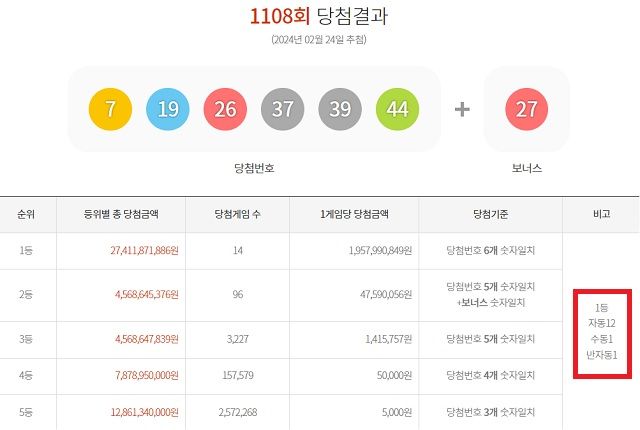 1108회 1등 자동 12명 24일 동행복권 추첨 결과에 따르면 1108회 로또당첨번호 조회 1등 당첨자 14명 중 12명은 자동으로 구매했다. 나머지 2명은 각각 수동, 반자동으로 샀다. /동행복권 캡처