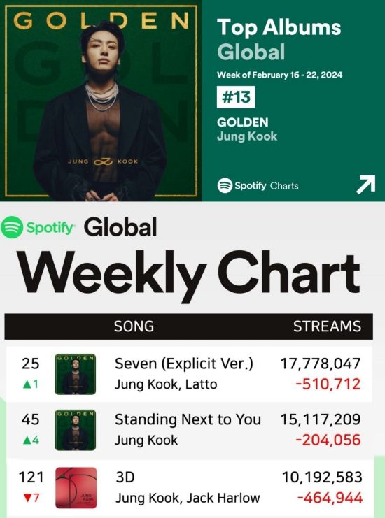 정국의 솔로 싱글 'Seven'과 '3D', 그리고 'GOLDEN' 앨범의 타이틀곡 'Standing Next to You'는 스포티파이 위클리 톱 송 글로벌 차트에서 각각 25위, 121위, 45위를 기록했다. 이 곡들은 각각 32주, 21주, 16주째 차트에 이름을 올리며 그의 글로벌 음원 파워를 입증했다.