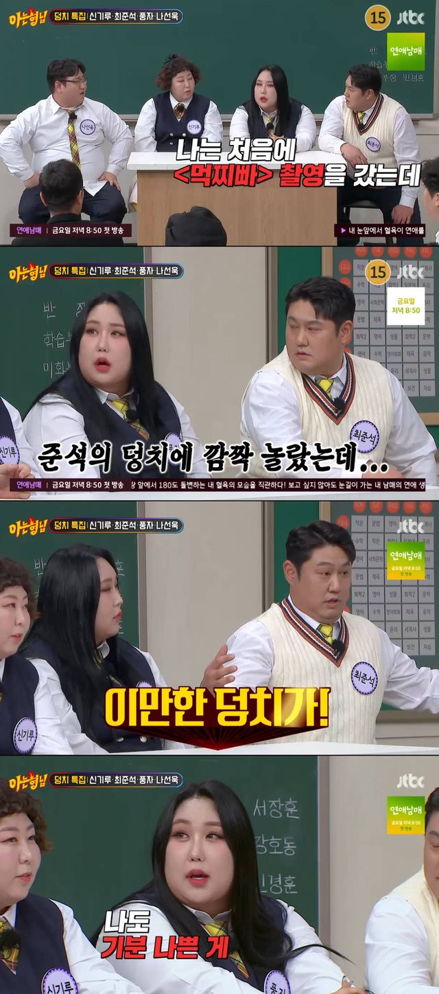 24일 방송된 JTBC '아는 형님'에서는 '먹찌빠'의 신기루, 최준석, 풍자, 나선욱이 게스트로 출연해 '덩치 특집'으로 펼쳐졌다.